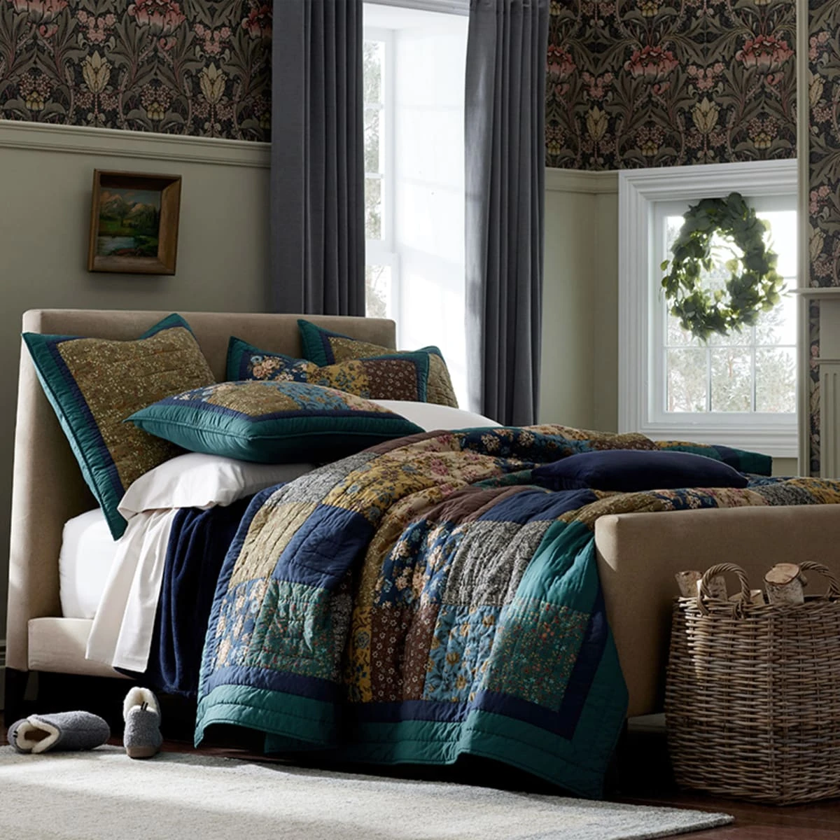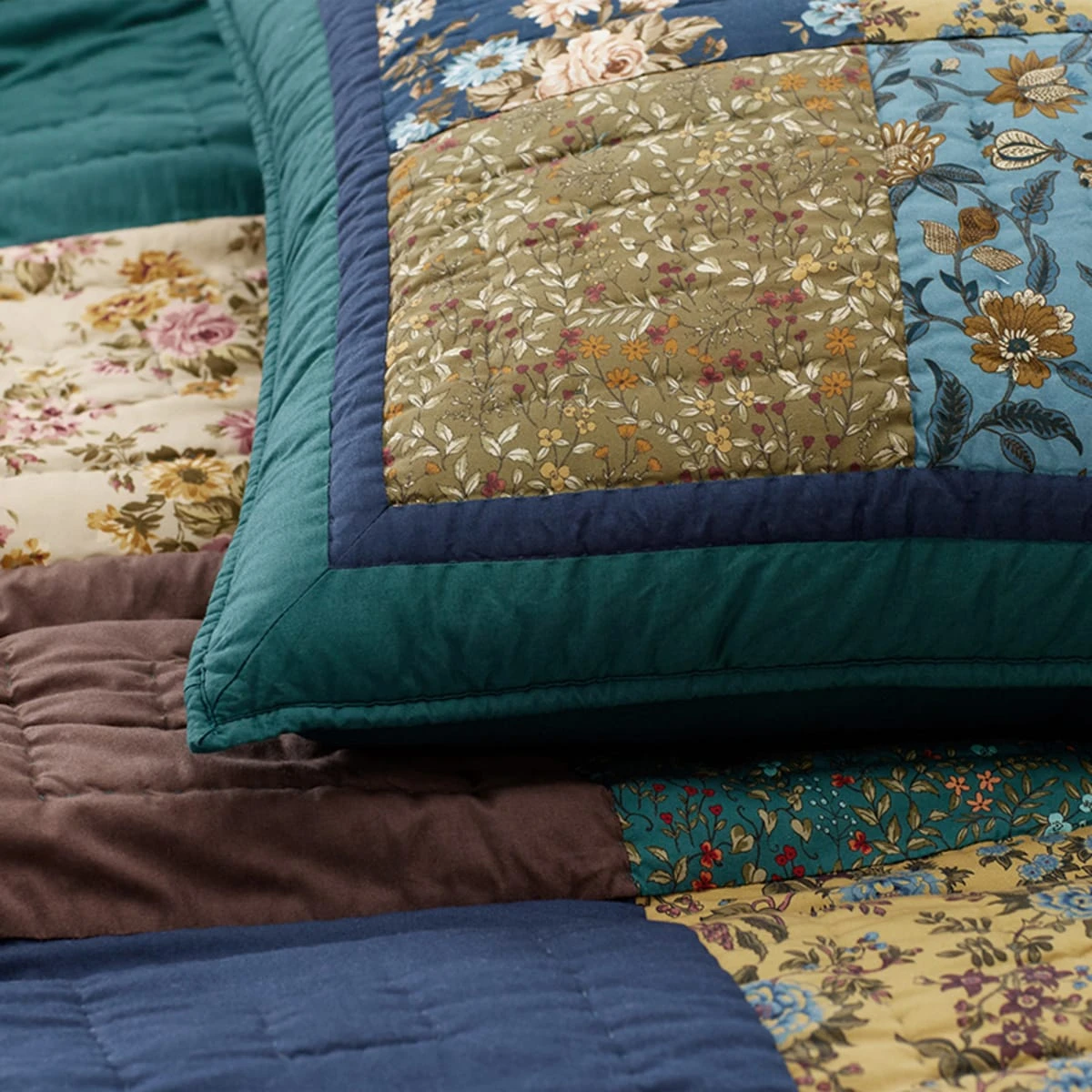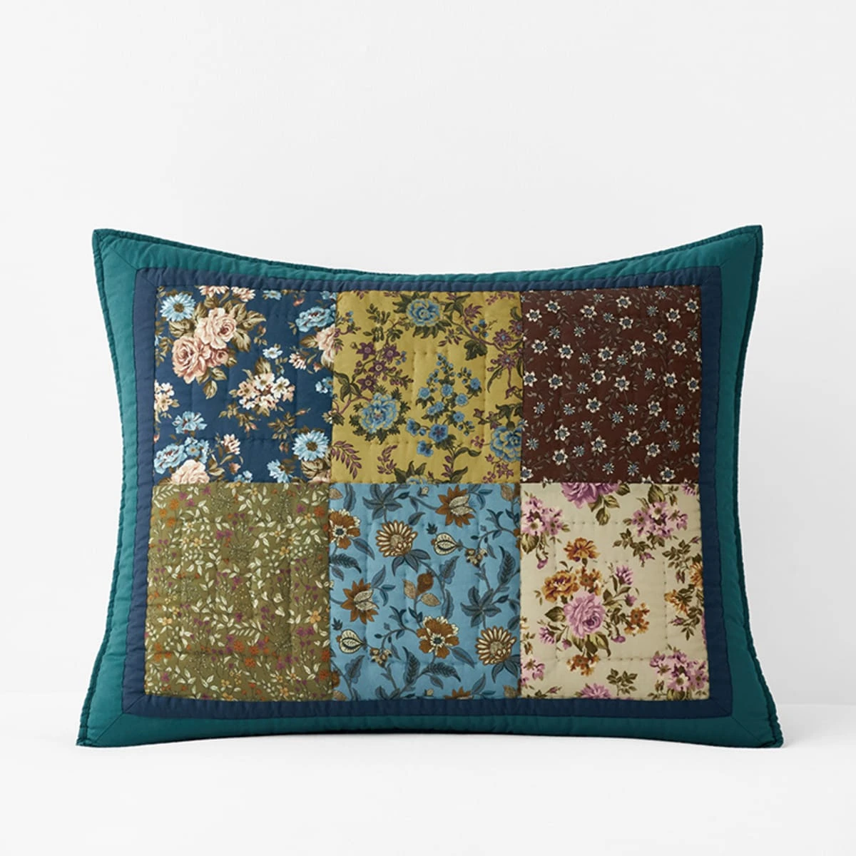 This signature patchwork sham beautifully brings together an eclectic mix of vintage wallpaper florals, vining botanicals, and elaborate medallions in hues that range from burgundy and cream to navy, olive, teal, and gold. This quilt and sham collection are handcrafted of pure cotton that’s been washed for inviting softness.