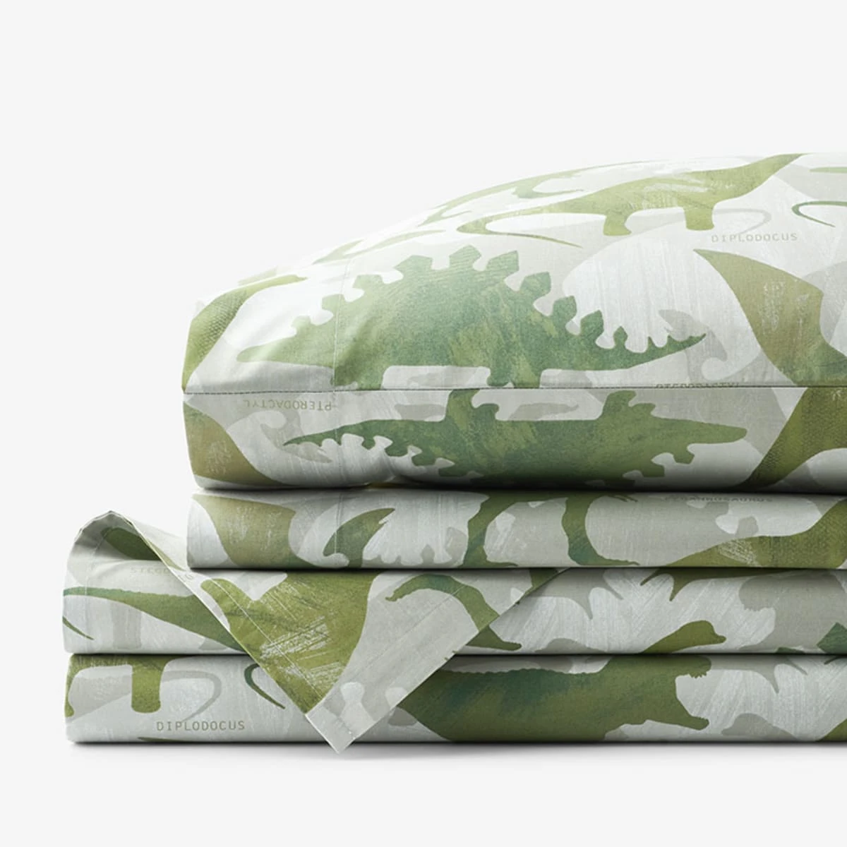 In this cool bedding collection, shadowy dinosaurs form a prehistoric collage on this sheet set, in a camouflage palette of olive, sage green, and gray. Welcome to Dino World! Sewn of organic cotton percale, this earth-friendly collection has a cool, crisp hand that gets better with every wash.