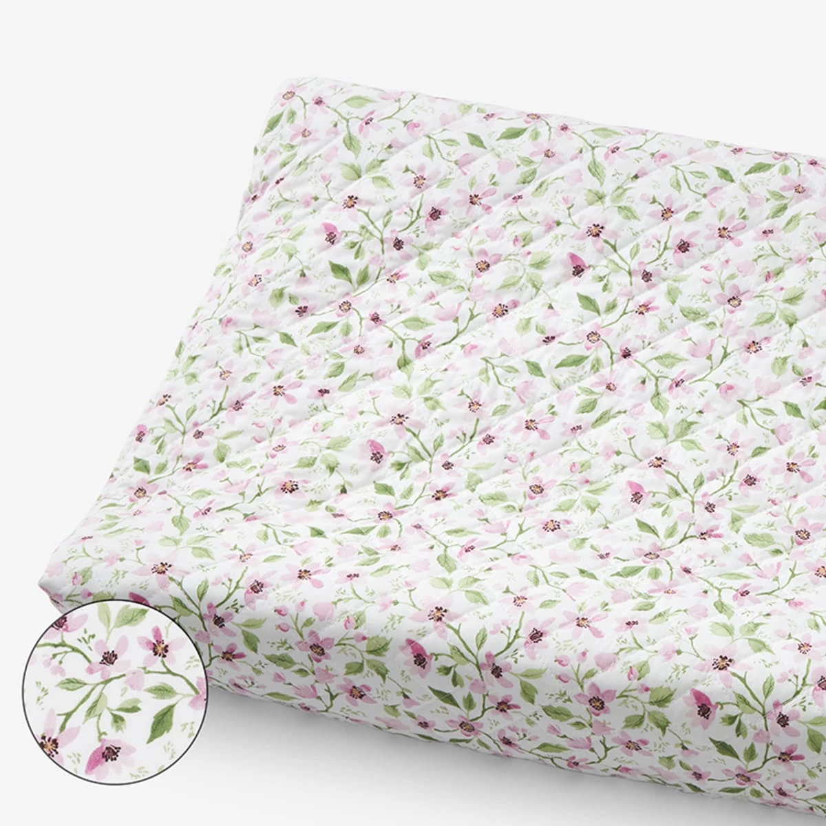 Sweet as can be, our Company Kids™ Lilah’s Floral Organic Cotton Percale Quilted Changing Pad Cover is landscaped with a field of petite posies. Captured in pretty shades of pink, green, and magenta, it adds calming color to the nursery. Sewn of certified organic cotton, our changing pad cover features a lightly padded design, providing a supersoft, comfy surface for your baby during changing time.