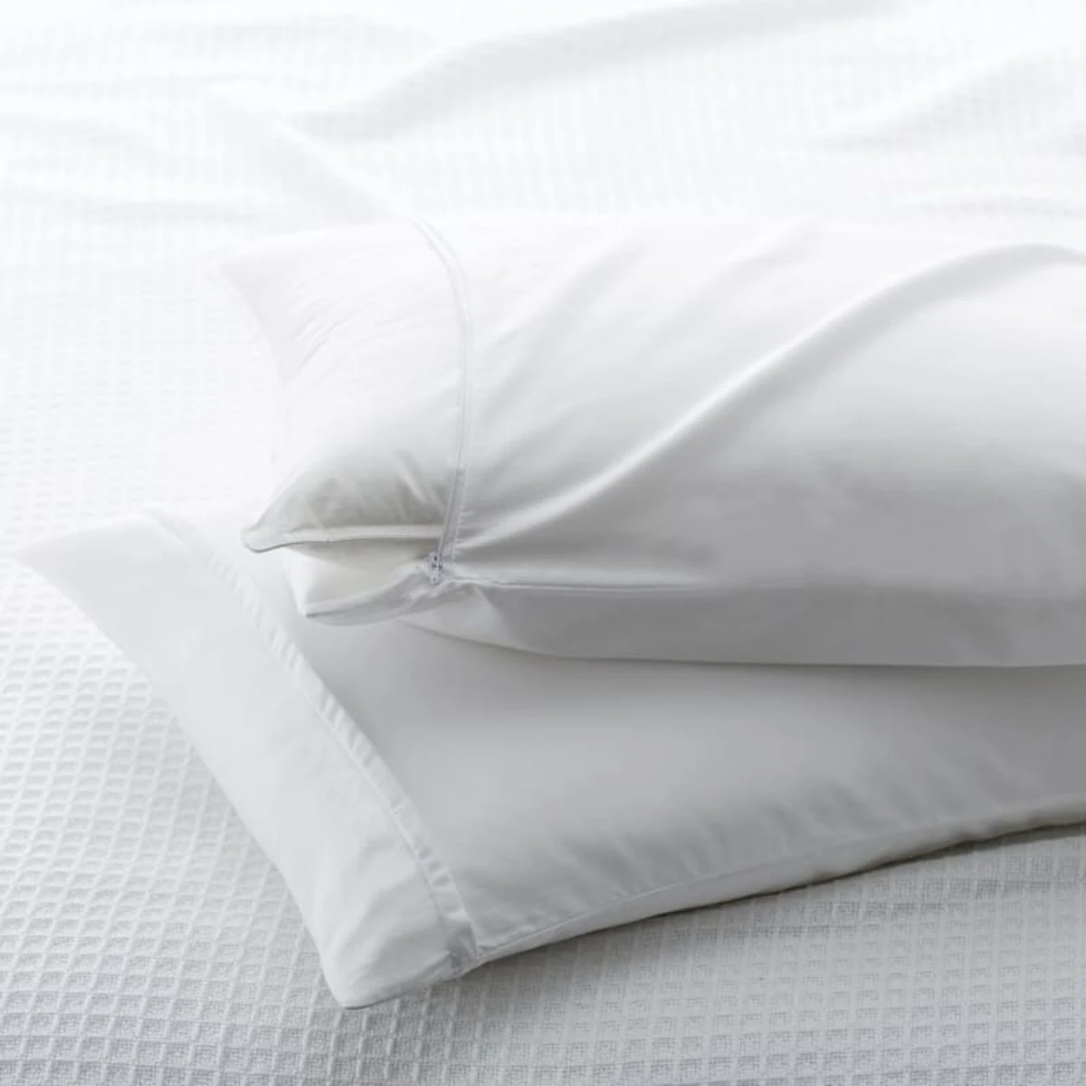 Choose our essential pillow protectors in three different fabric and quality levels, a cotton pillow protector, sateen cotton pillow protector, and damask pillow protector. Our specialty pillow protectors are also available in a bed bug protective pillow cover option and a dust-mite proof pillow cover option. These two innovative styles keep pesky bed bugs and annoying allergies at bay. A great way to extend the life of your pillow and improve the quality of your sleep, pillow protectors keep all your pillows clean and dust-free night after night. See what a difference well-crafted pillow protectors make on your bed and in your life. All pillow protectors are sold individually.