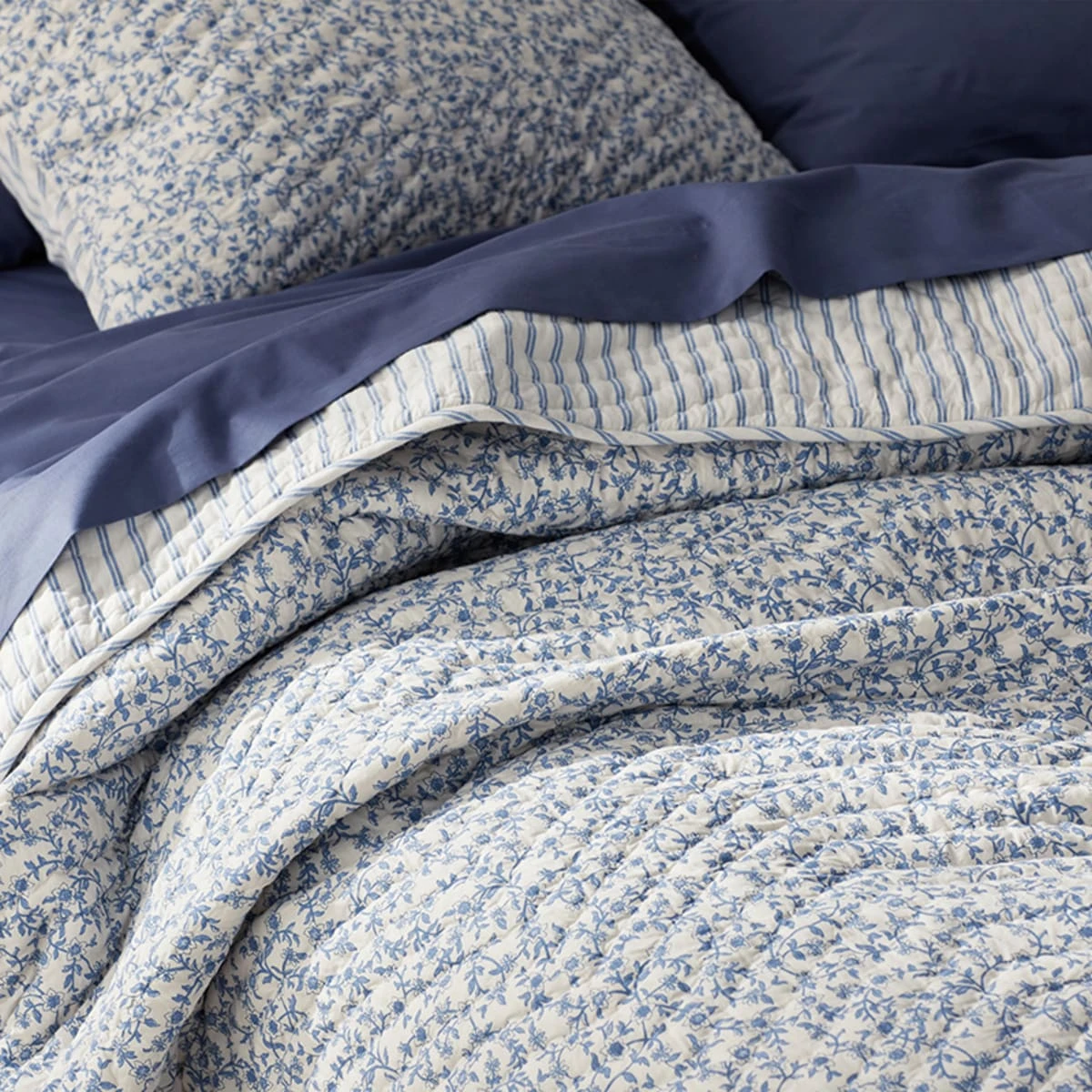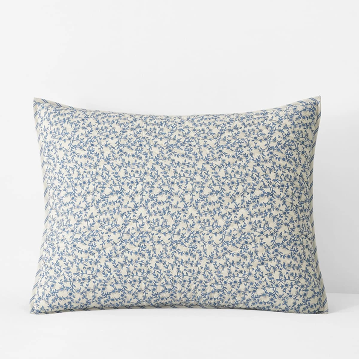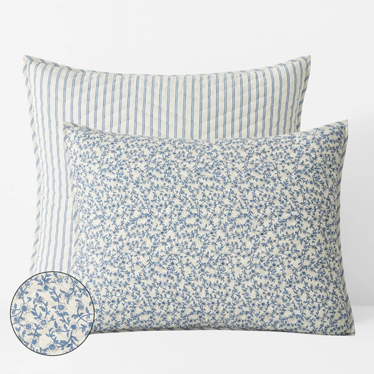 A beautiful addition to the bed, the reversible Jenny Floral Stripe Quilted Sham features restful shades of porcelain blue and cream. Should you need a change from the charming vining floral print, just flip this lightweight, whole-cloth quilted sham to reveal a classic pinstripe in the same colorway. Handcrafted by skilled artisans and washed for lived-in softness so it’s as comfortable as it is beautiful.