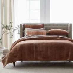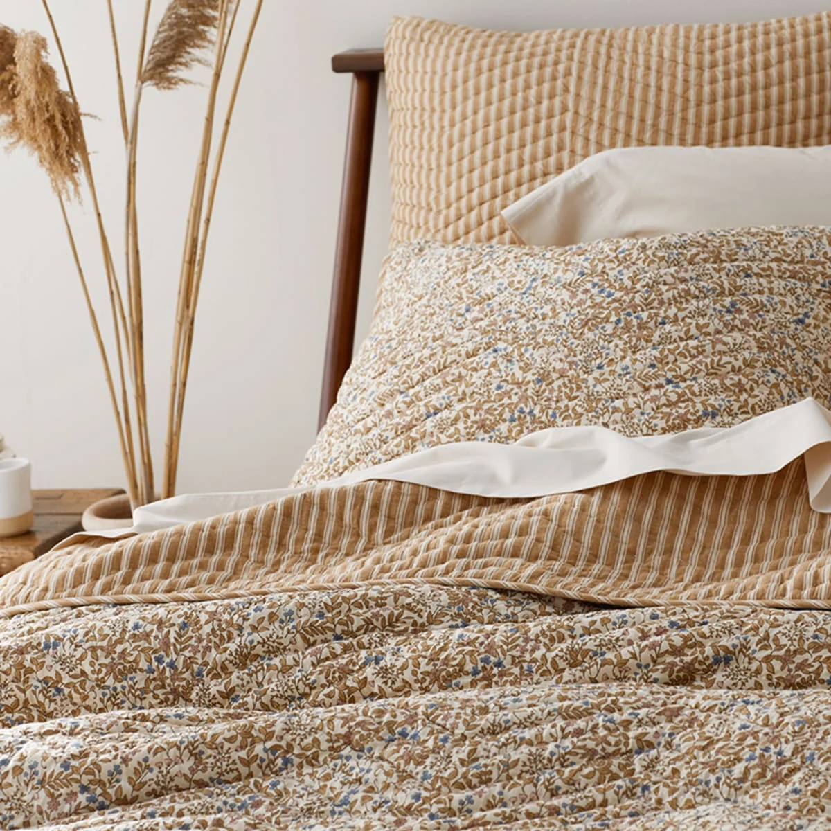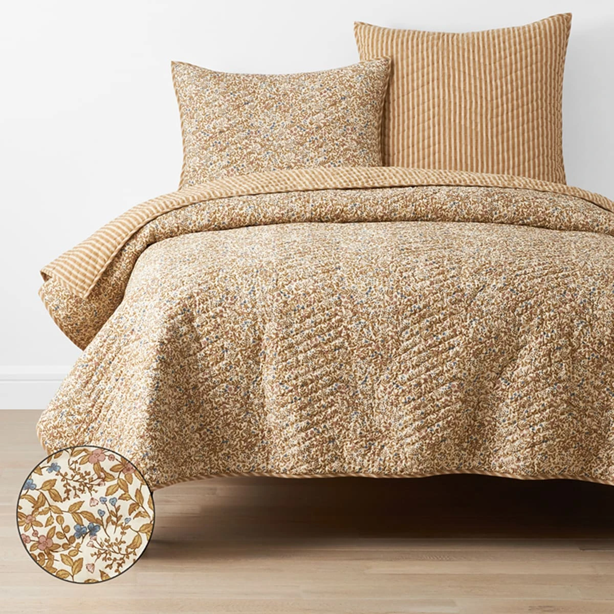 Two lovely looks in one, this lightweight, reversible whole-cloth quilt gives you the option to display a petite floral in autumnal shades of taupe, dusk blue and rose, or go for a more streamlined look with cream and taupe stripes on the reverse. Quilted by hand in wavy chevrons for rich texture. Handcrafted by skilled artisans and washed for lived-in softness so it’s as comfortable as it is beautiful.