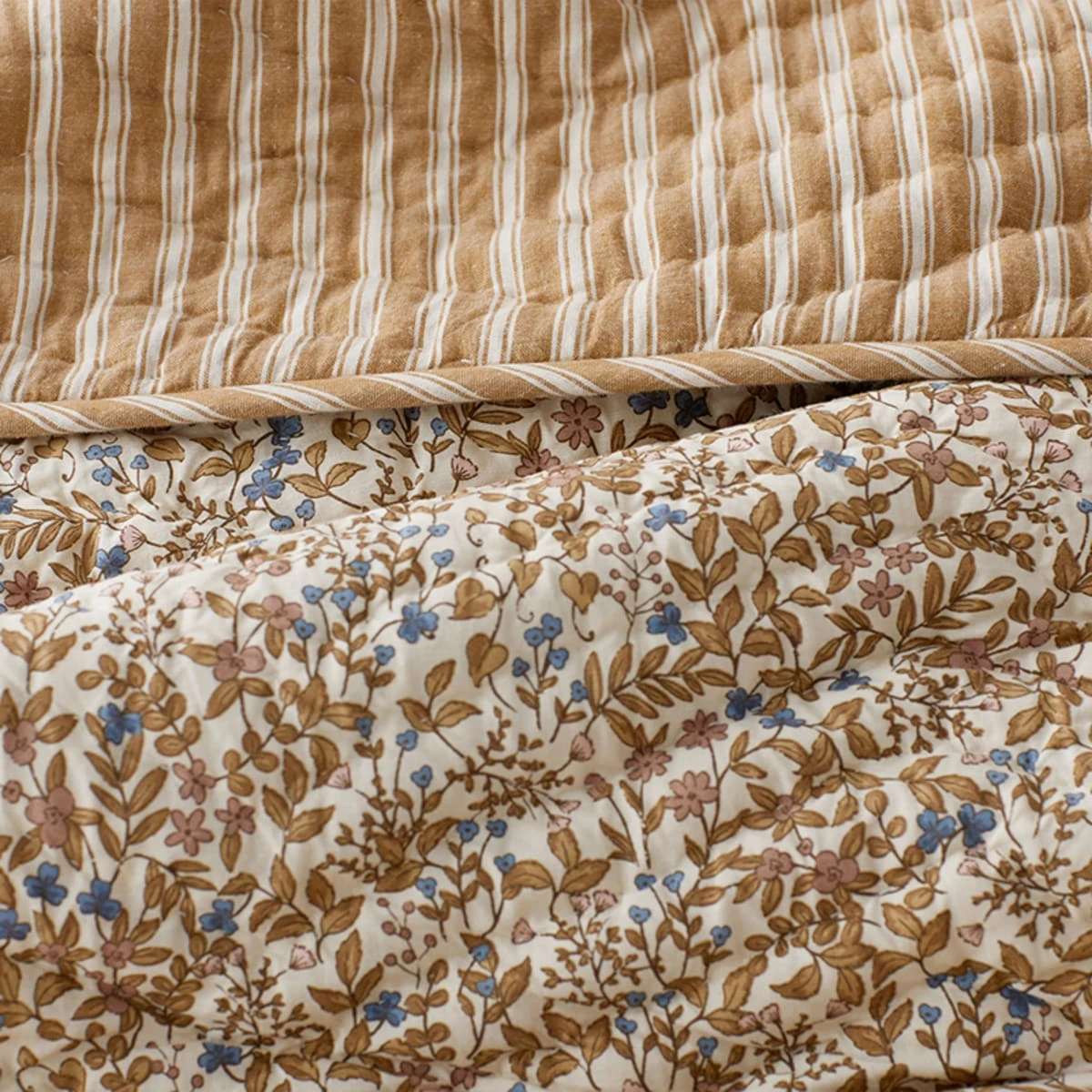 Two lovely looks in one, this reversible whole-cloth quilted sham gives you the option to display a petite floral in autumnal shades of taupe, dusk blue and rose, or go for a more streamlined look with cream and taupe stripes on the reverse. Quilted by hand in wavy chevrons for rich texture. Handcrafted by skilled artisans and washed for lived-in softness so it’s as comfortable as it is beautiful.
