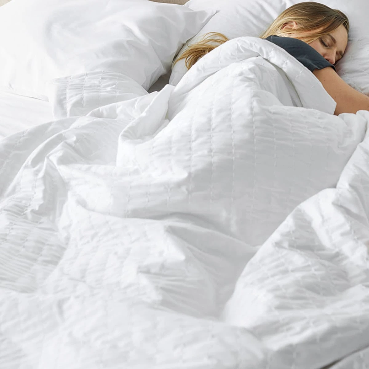 A blanket that reduces stress—sign us up! Our weighted blanket cocoons you in comfort, providing deep pressure therapy in your own home resulting in less stress and a deeper, more restful sleep. The quilted insert is filled with the quietest micro glass beads for a peaceful, even weight—like a gentle hug from someone you love without the noise of other blankets—while the breathable cotton shell is great for year-round use. The icing on the cake…our blanket features a continuous 3-sided zip closure, so it’s easy to remove for laundering and keeps the blanket firmly in place when in use.