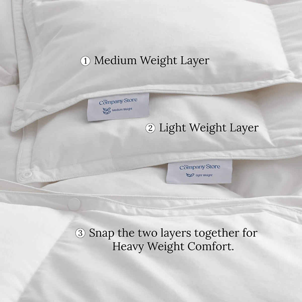 Introducing the Legends Hotel™ 3-in-1 Down Comforter, the most ingenious comforter ever! Plumped with lofty, ethically sourced RDS-certified down, this multi-season comforter is actually three comforters in one. Cleverly constructed of two separate layers (one lightweight and one medium weight) that are connected by snaps. Use the light layer for warmer nights, the medium weight layer, for cooler nights, or snap them together for maximum warmth when the temperatures plummet.