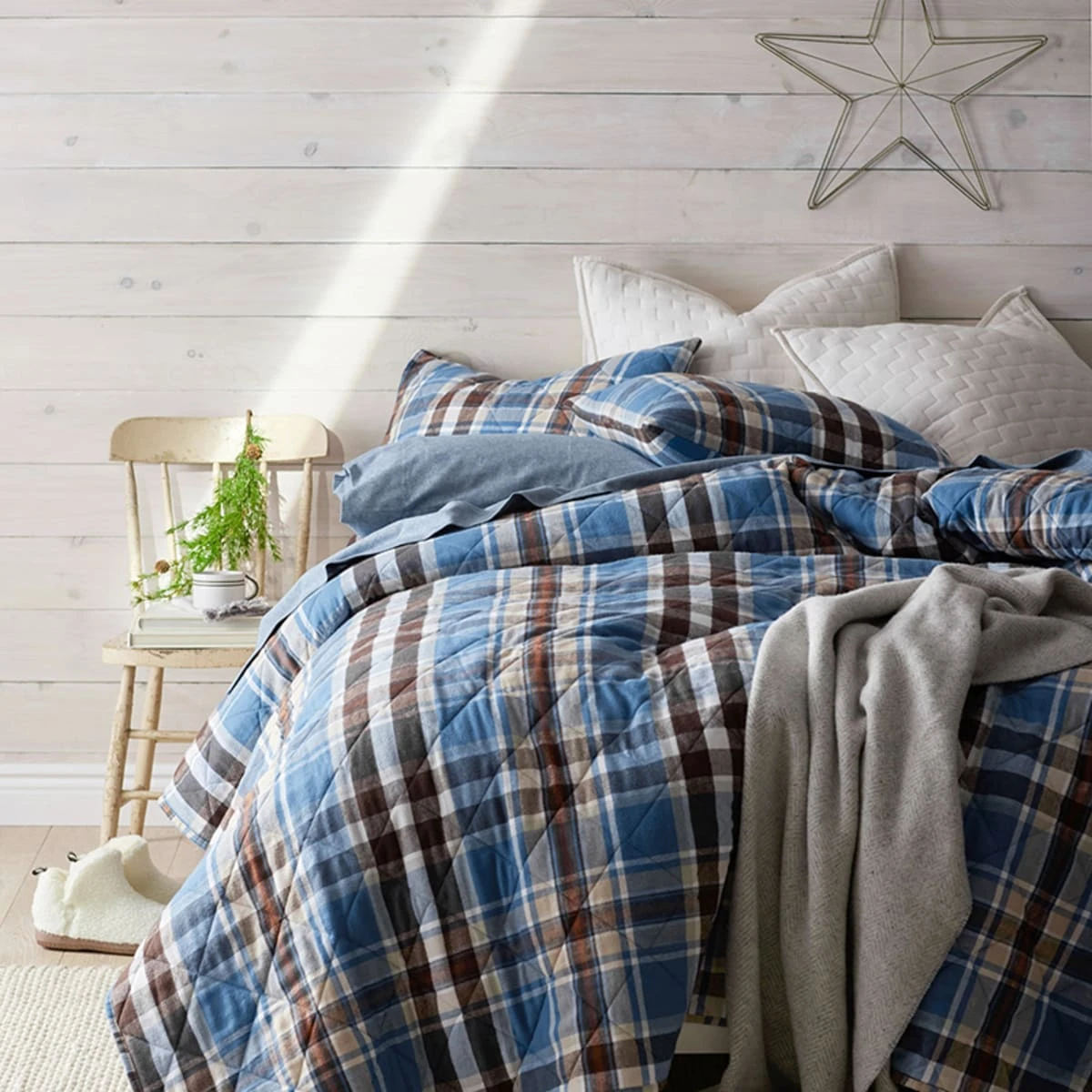 Our love of plaid continues with this classic sham patterned with a yarn-dyed design in your choice of neutrals: navy and cream or black and cream. Beautifully crafted in Portugal with lightweight polyfill and quilt stitching, it’s perfect as a stand-alone coverlet or as layering piece when temperatures dip.
