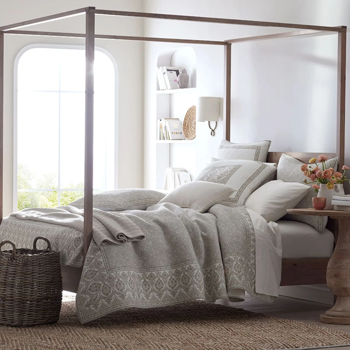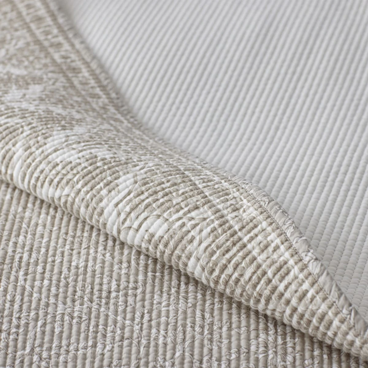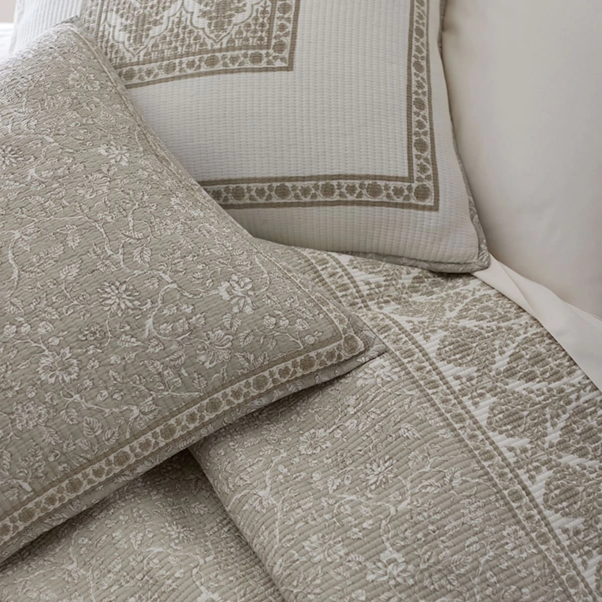 Featuring a vining floral print in understated neutrals, our Lydia cotton voile quilt achieves its oh-so-appealing texture through linear vermicelli stitching. Handcrafted of lightweight cotton voile and framed with a contrast border of traditional Indian floral medallion, this original design is handcrafted by skilled artisans and washed for lived-in softness.