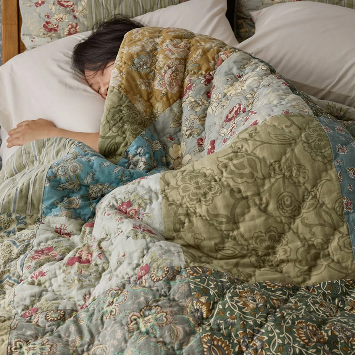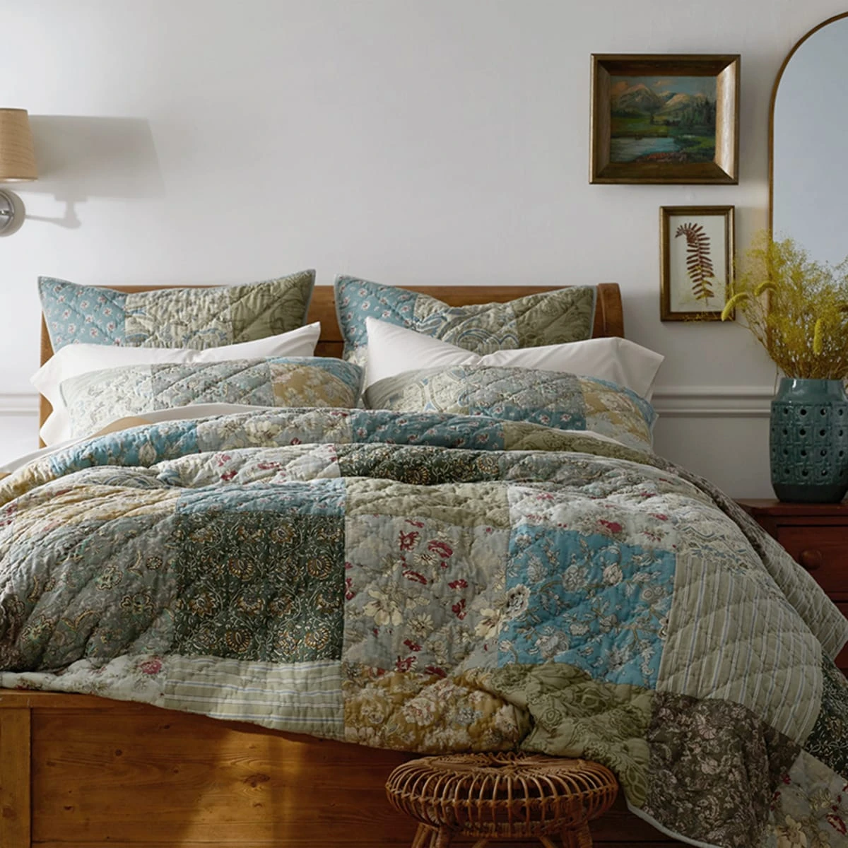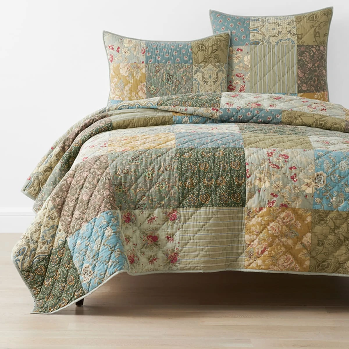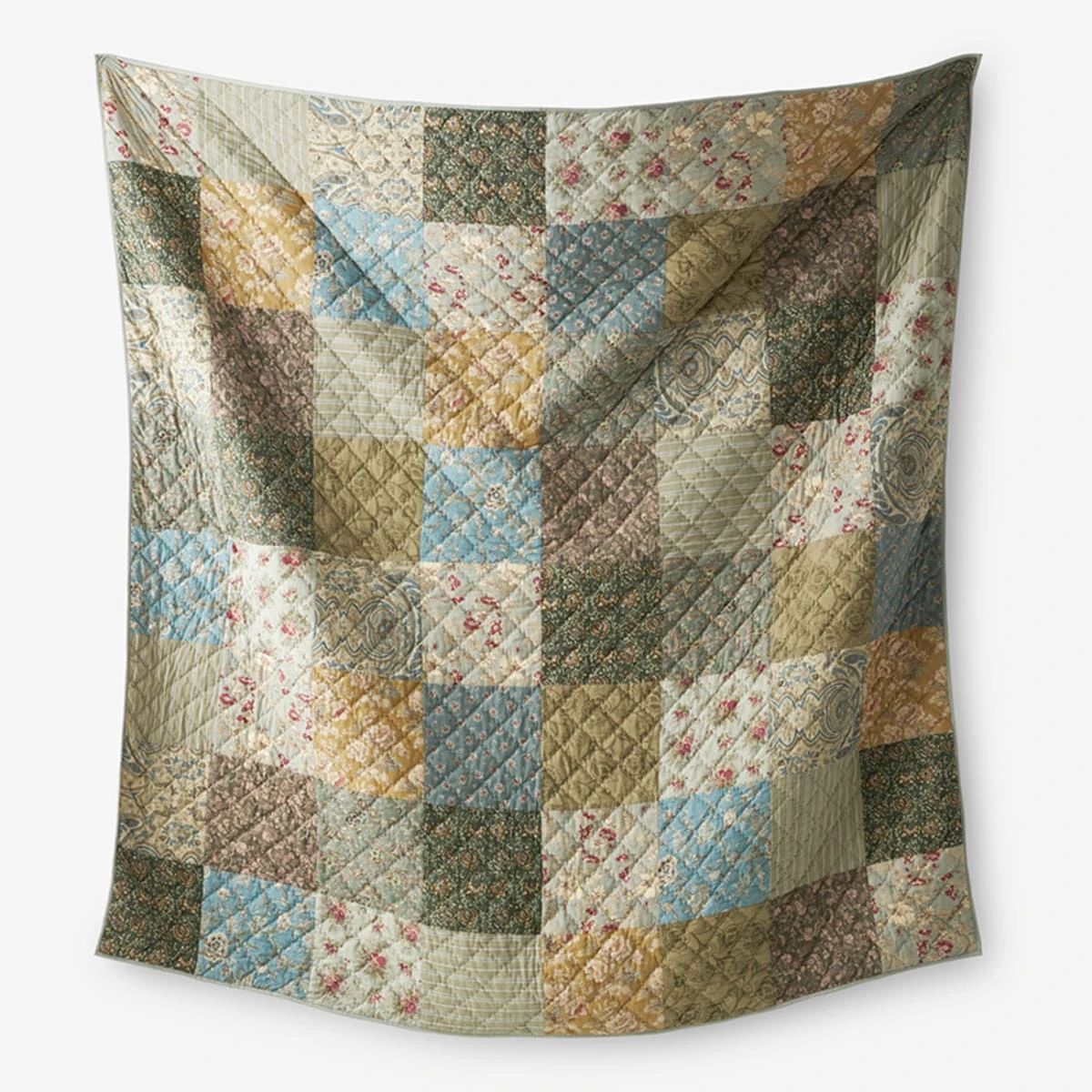 Artfully pieced from blocks of vintage florals in weathered shades of gold, soft blue, and green, our Winter Floral Patchwork Quilt has a charming heirloom presence—like something you might have inherited from a well-loved relative. Handcrafted by skilled artisans and washed for lived-in softness so it’s as comfortable as it is beautiful.