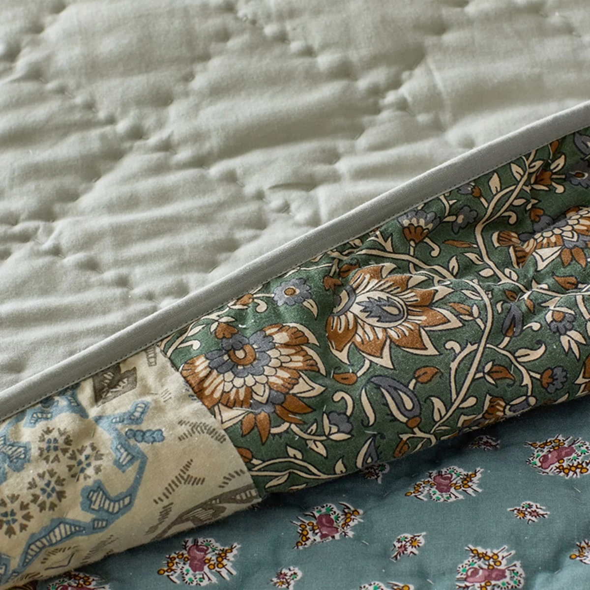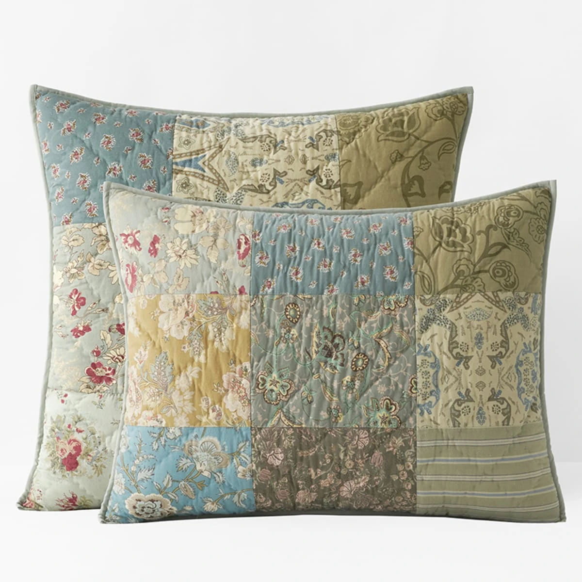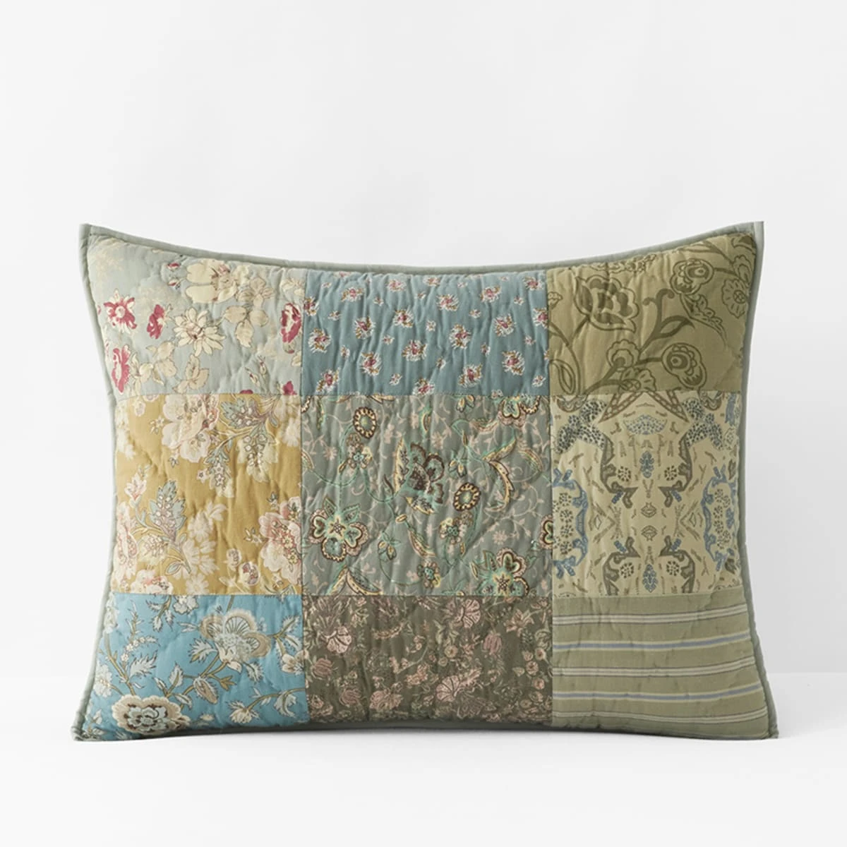 Artfully pieced from blocks of vintage florals in weathered shades of gold, soft blue, and green, our Winter Floral Patchwork Quilted Sham has a charming heirloom presence—like something you might have inherited from a well-loved relative. Handcrafted by skilled artisans and washed for lived-in softness so it’s as comfortable as it is beautiful.